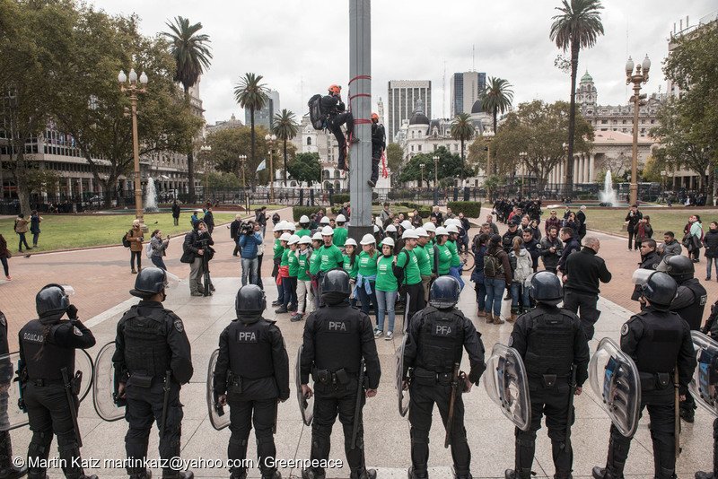 La historia de la ley también está cruzada por intervenciones públicas que tuvieron un fuerte impacto simbólico. En 2011, activistas de Greenpeace bloquearon los accesos a Veladero y Pascua Lama con un campamento de alta montaña, reclamando la aplicación plena de la norma ante las maniobras judiciales impulsadas por la empresa Barrick Gold. Dos años después, otro grupo de activistas escaló el Centro Cívico de San Juan y desplegó un cartel dirigido al entonces gobernador José Luis Gioja, alertando sobre los riesgos para la Reserva de Biosfera San Guillermo. En 2016, la organización volvió a la escena pública descolgando un cartel de 40 metros en el Obelisco para exigir el cierre de Veladero tras el derrame de cianuro y mercurio ocurrido en 2015. Más recientemente, en 2024, una activista intervino durante el debate de la ley ómnibus con un mensaje directo: “el ambiente no se negocia”. La acción formó parte de la campaña Salvá Las Leyes Ambientales, que reunió más de 140 mil firmas.